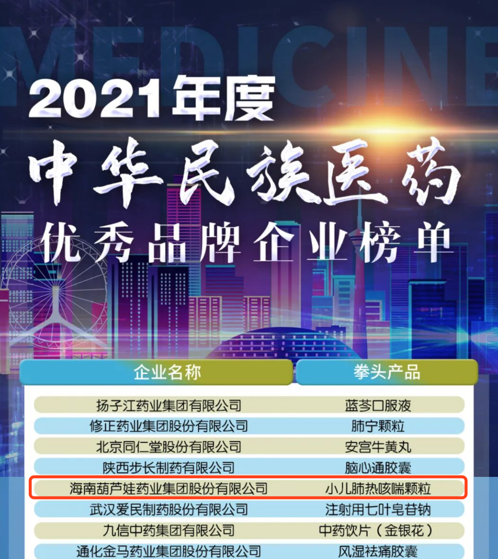 12月29日,全国工商联医药业商会发布了“2021年度中华民族医药优秀品牌企业榜单”,PA尊龙时凯药业集团凭借黄金单品小儿肺热咳喘颗粒(4克)实力登榜。