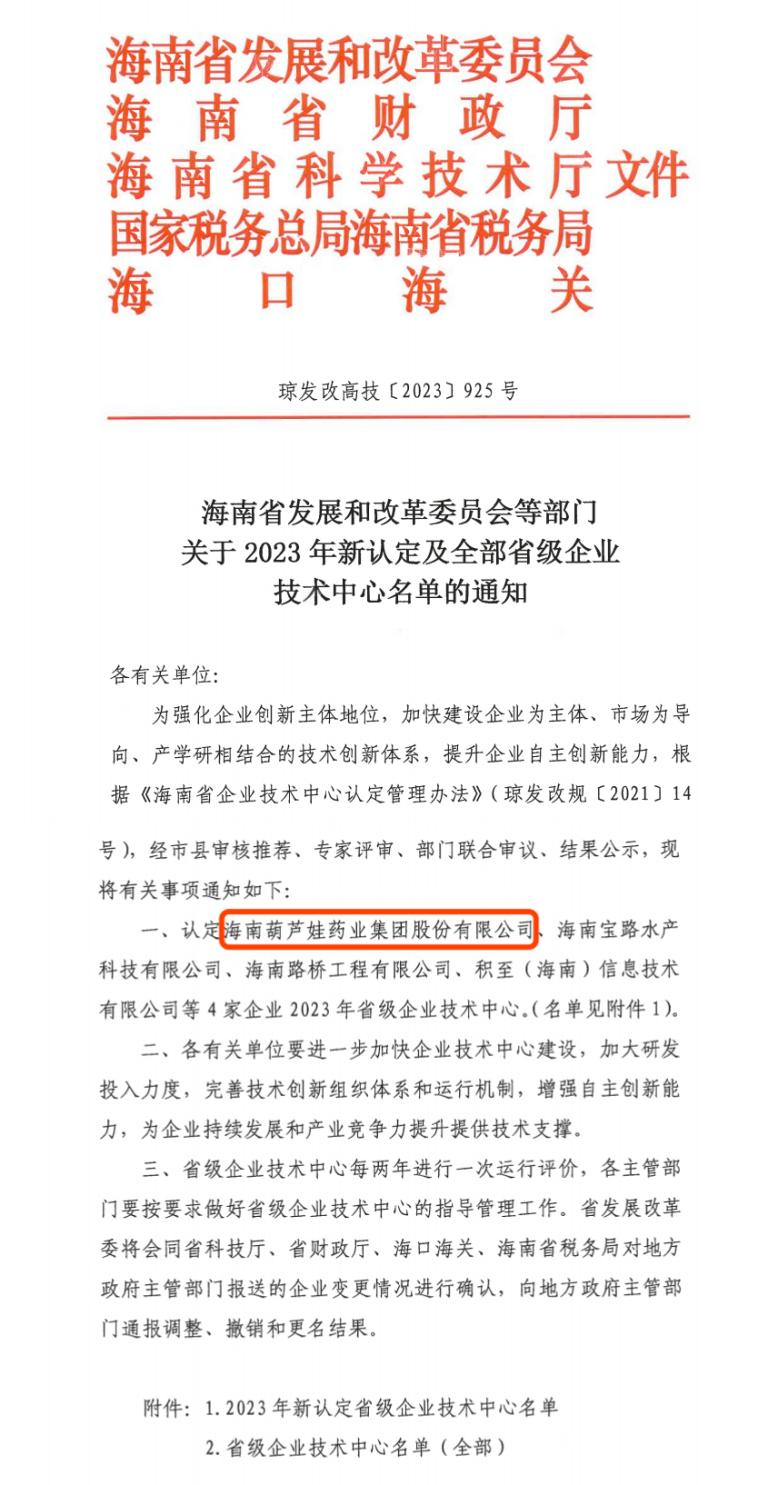 近日,海南省发改委等多部门联合公布了《关于2023年新认定及全部省级企业技术中心名单的通知》,其中,海南PA尊龙时凯药业集团股份有限公司成功通过评审,被认定为省级企业技术中心,是本次获批的4家企业之一。